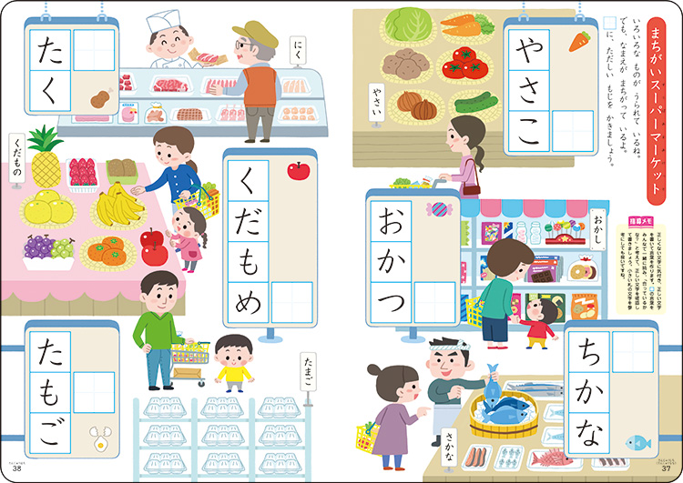 ひらがなの清音、濁音、半濁音、促音、拗音を書く練習をしましょう。清音は、「し」「つ」「く」「へ」といった、文字の特徴をとらえやすい順番に並べてあります。子どもたちが苦手な書き順も、色別でわかりやすく示されているので無理なく学べます。最後には名まえを書くページもあり、達成感を得られます。言葉遊び、数字の練習、カタカナ表もあります。