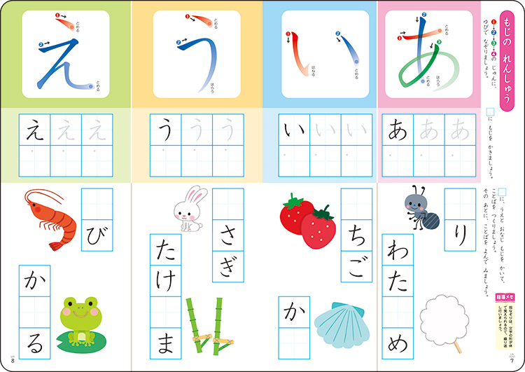 ひらがなの清音、濁音、半濁音、促音、拗音を書く練習をしましょう。清音は、五十音順に並べてあります。子どもたちが苦手な書き順も、色別でわかりやすく示されているので無理なく学べます。最後には名まえを書くページもあり、達成感を得られます。言葉遊び、数字の練習、カタカナ表もあります。