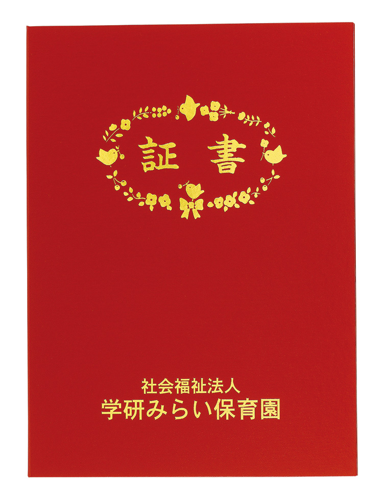 ●材質:紙(ハードカバー)●寸法:31.7×23.3cm(29.7×21cmの証書が入ります)※園名代 1部につき 220円(10%)(税別200円) 園章代 1部につき 377円(10%)(税別343円