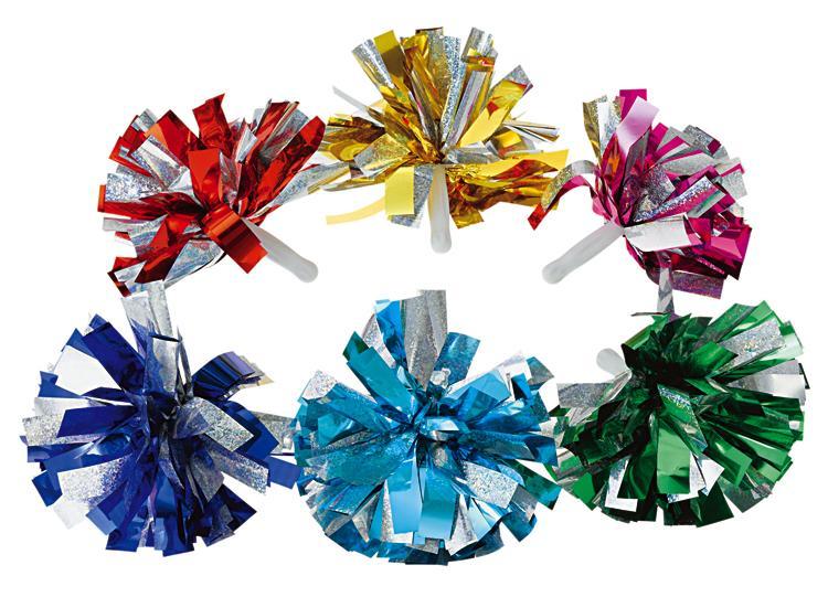カラーとホログラムのフィルムが交互に重なり、キラキラ輝くカラフルでボリューム感たっぷりのポンポンです。取っ手付で誰にでも持ちやすくなっています。完成品ですので、フィルムを広げる手間もかかりません。