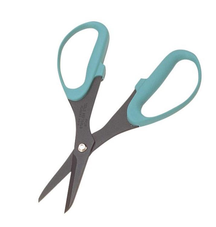 工作のやりやすいように、刃先にギザ刃が付いたハサミです。ハンドルが大きく、柔らかい樹脂を使用った、手に優しいタイプです。また、刃にフッ素コートをしてあるので、クラフト粘着テープなどを切った際にも刃がベタつきません。