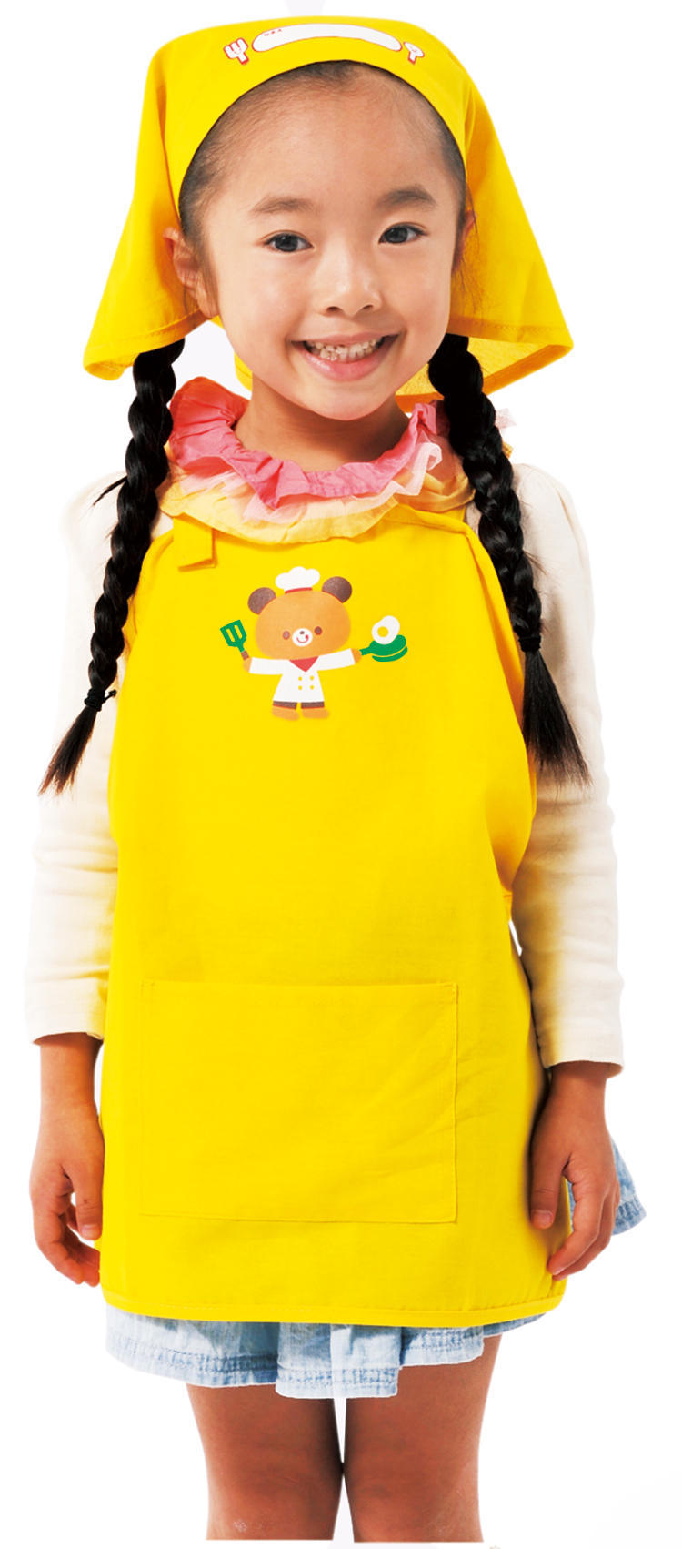 エプロンのひもは面ファスナー、三角巾はゴム留めでかぶるので、着脱がらくに行えます。エプロンはポケット付。エプロン・三角巾ともに名まえ欄付