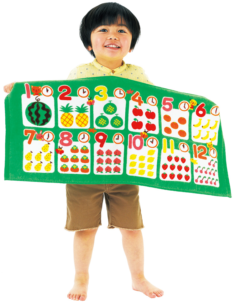 かわいいイラスト入のすうじ表のフェイスタオルです。肌触りがよく、しっかりした生地です。名まえ記入欄付 袋入