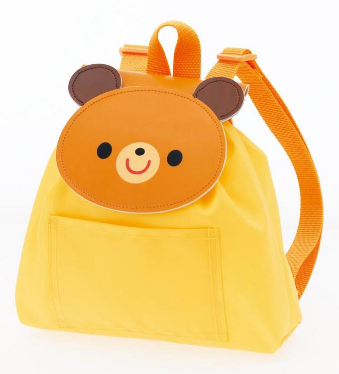 ふたは面ファスナー、袋の口はきんちゃく式です。アジャスターで肩ひもの長さを調整できます。外ポケット付