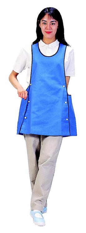 カラフルな色合いの、先生用のエプロンドレスです。ポイントにバイヤス処理が施されています。左脇あきで脇ゴム入りなので、着心地がよく、動きやすくなっています。両サイドにポケットが付いています。