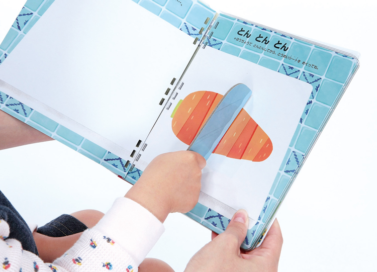 絵/毛利洋子 包丁(紙製)で、食材をトントンして、透明シートをめくると、なんと食材が切れています。野菜をトントンと切っていき、おいしいカレーライスを作りましょう。