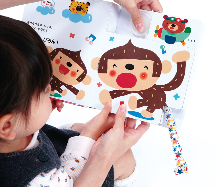 • 絵/西内としお ポンプを押すと、ピロピロと音がしながら仕掛けが押びていきます。 サルのしっぽや、ゾウの鼻、へビの舌などがかわいらしく伸び縮み。繰り返し押して遊びましょう。