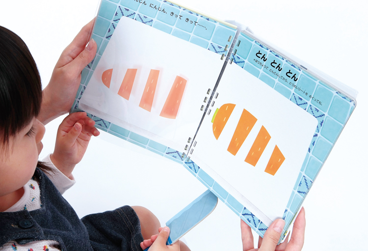 • 絵/毛利洋子 包丁(紙製)で、食材をトントンして、透明シートをめくると、なんと食材が切れています。野菜をトントンと切っていき、おいしいカレーライスを作りましょう。
