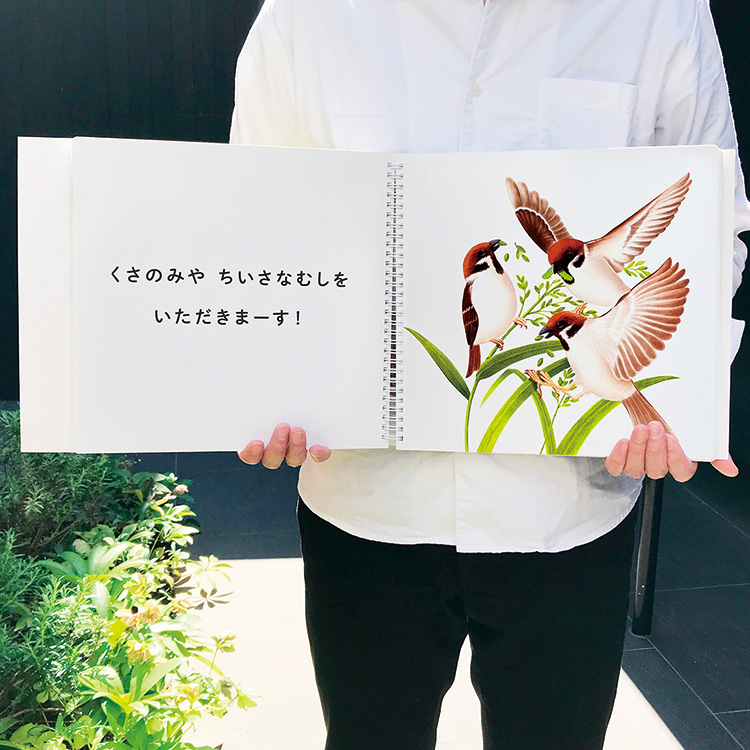 動物のごはんがテーマのしかけ絵本。しかけ扉をめくると、食事をしている動物たちが登場します。これは だれのごはんかな?