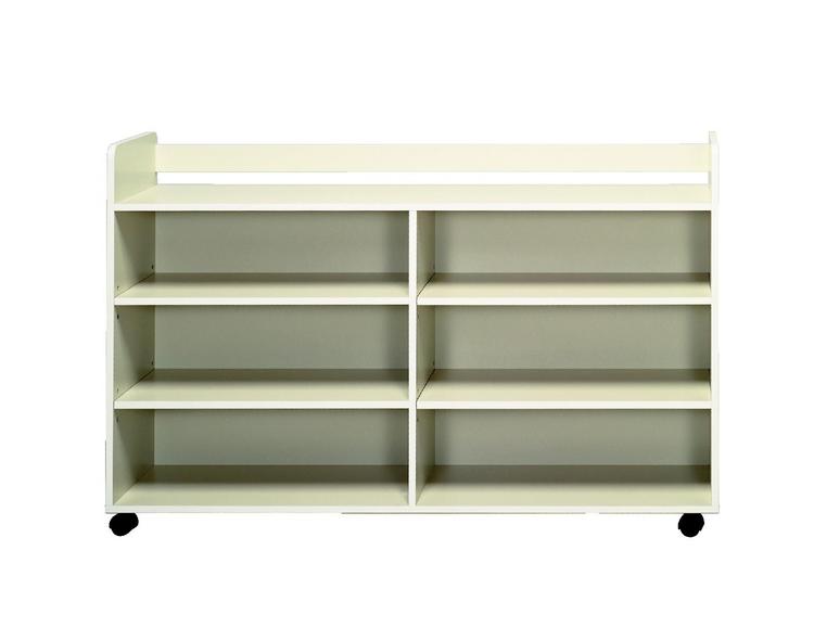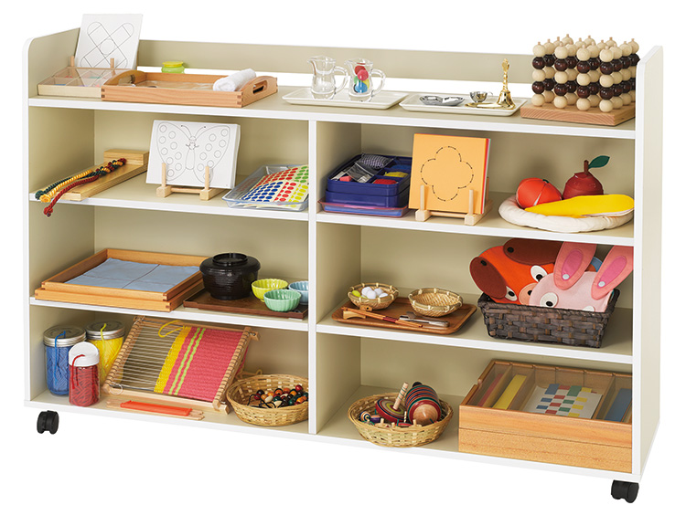 3・4歳児にぴったりの使いやすい教具棚です。日常生活用具でも感覚教具でも収納可能です。『日常練習用具棚(小)』と同じ高さなので、併用が可能です。前面のキャスターはストッパー付。背面仕上