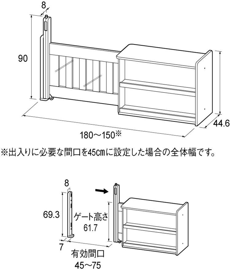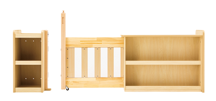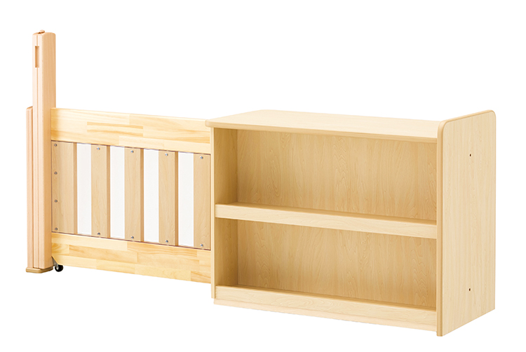 つながるラックシリーズに組み合わせて使えるゲートです。ロック操作部は幼児の手の届きにくい位置に配置してあります。広く開口部を取っているため給食運搬用カートが通ることができます。