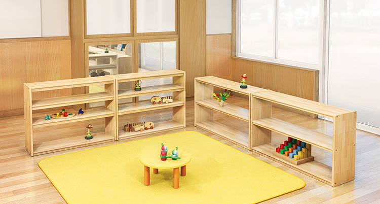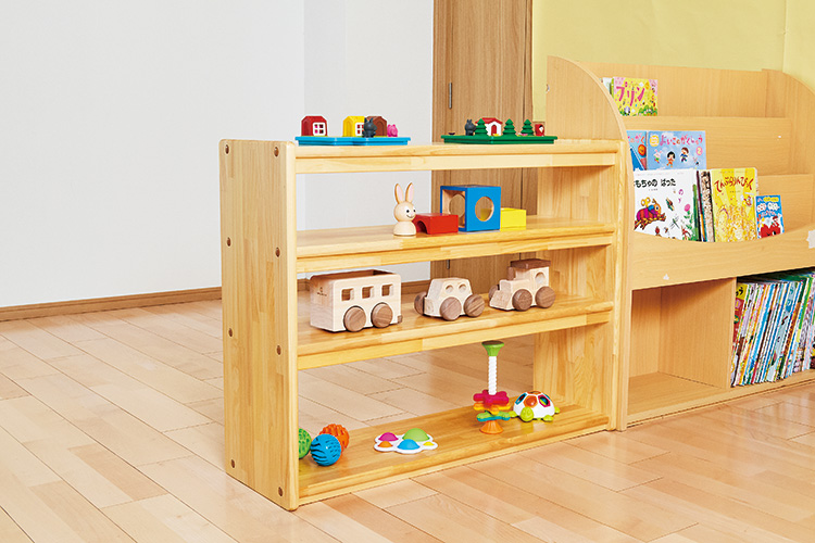 取りたくなるオープン棚の3段タイプです。子どもの目線におもちゃなどを並べることができ、「主体的」に関わり、自ら「選ぶ」ことをサポートします。間仕切りとしても使え、ちょっとしたスペースを作る際に役立ちます。