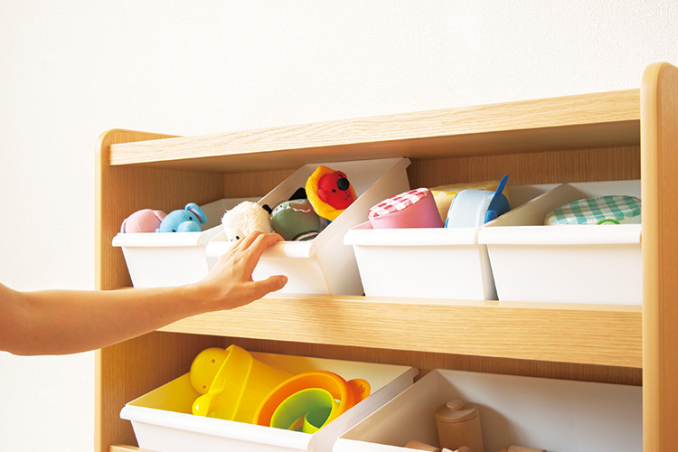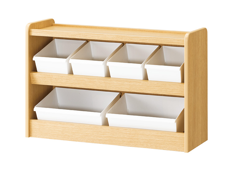 板が斜めで中身が見えやすくなっています。玩具の収納に便利なトレーが付属しています。