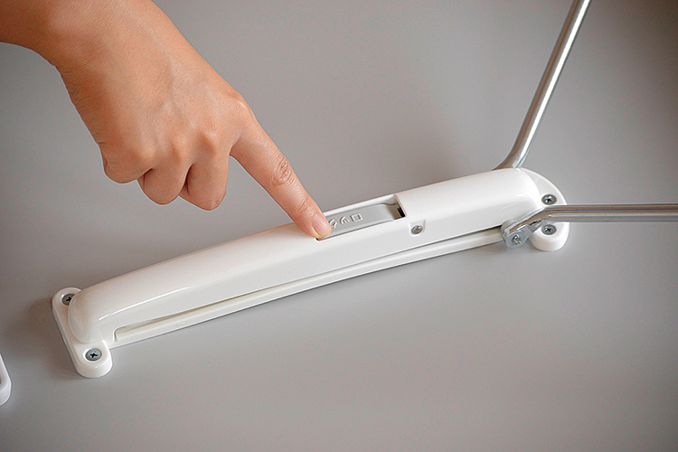 ワンタッチで脚を折りたたむことができ、脚を起こすとロック時にカチッと音がします。天板は、メラミン化粧合板でキズがつきにくく、丈夫で軽量なテーブルです。裏面のグリップはコンパクトで持ちやすい形状になっています。