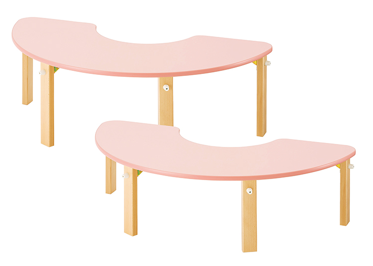 食事や遊びに向かい合って対応できる3人用半円テーブルで折りたたみができます。テーブルの高さ34cmで座面の高さ約18cmの椅子、高さ40cmで約22cmの椅子と組み合わせて使用できます。