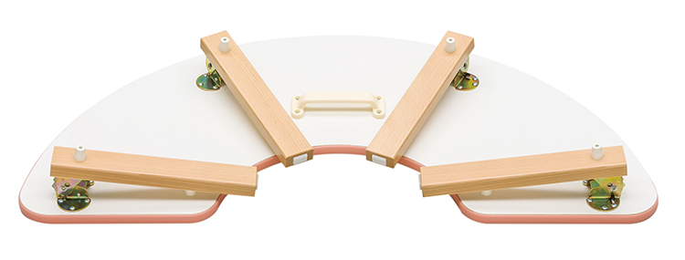 食事や遊びに向かい合って対応できる3人用半円テーブルで折りたたみができます。テーブルの高さ34cmで座面の高さ約18cmの椅子、高さ40cmで約22cmの椅子と組み合わせて使用できます。