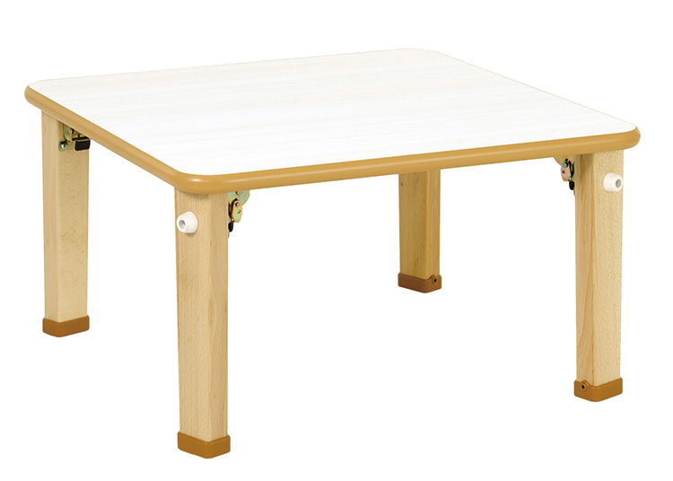 天板表面は、抗ウイルス仕様の化粧板を採用。アレルギーのある乳幼児と一緒に食事するときや、食事中の補助テーブルとしても便利にお使いいただけます。脚キャップにはエラストマー製のゴムを内蔵。フローリングでも滑りにくくテーブルが安定します。