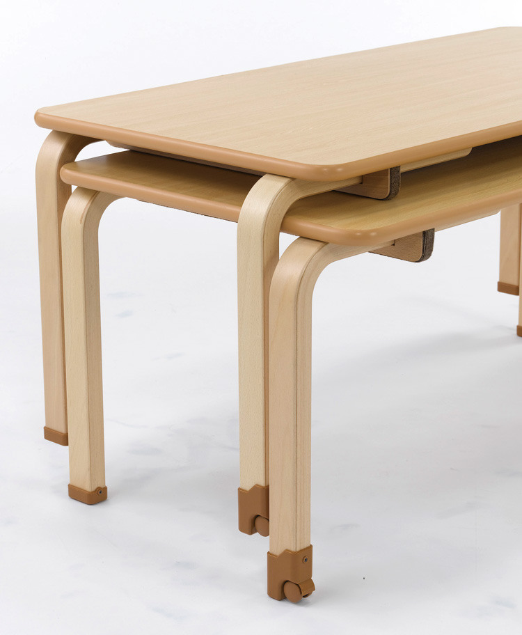 スタッキングができる6人用木製固定型テーブルの軽量タイプです。裏面にはスタッキングのときにスライドしやすいように、天板保護を兼ねた素材を取り付けています。