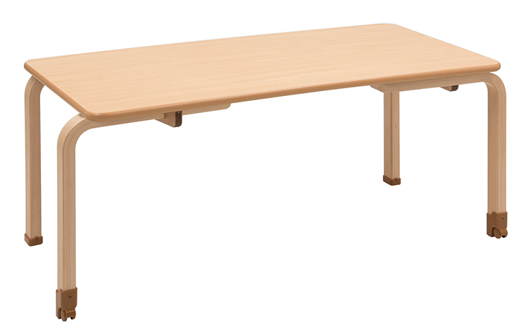 スタッキングができる6人用木製固定型テーブルの軽量タイプです。裏面にはスタッキングのときにスライドしやすいように、天板保護を兼ねた素材を取り付けています。