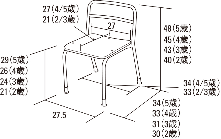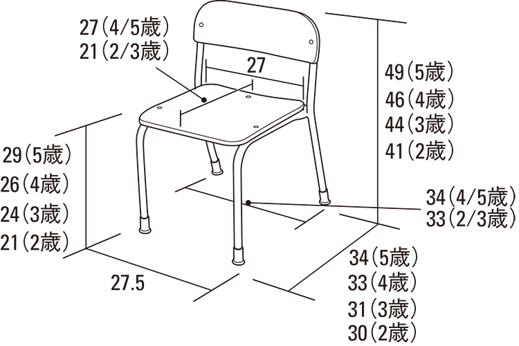 キズ、ささくれができにくい、耐久性が高いイスです。行事のときなど、異なる年齢のクラスが一緒になった場合でも見分けやすいように、各サイズで脚キャップの色を変えてあります。
