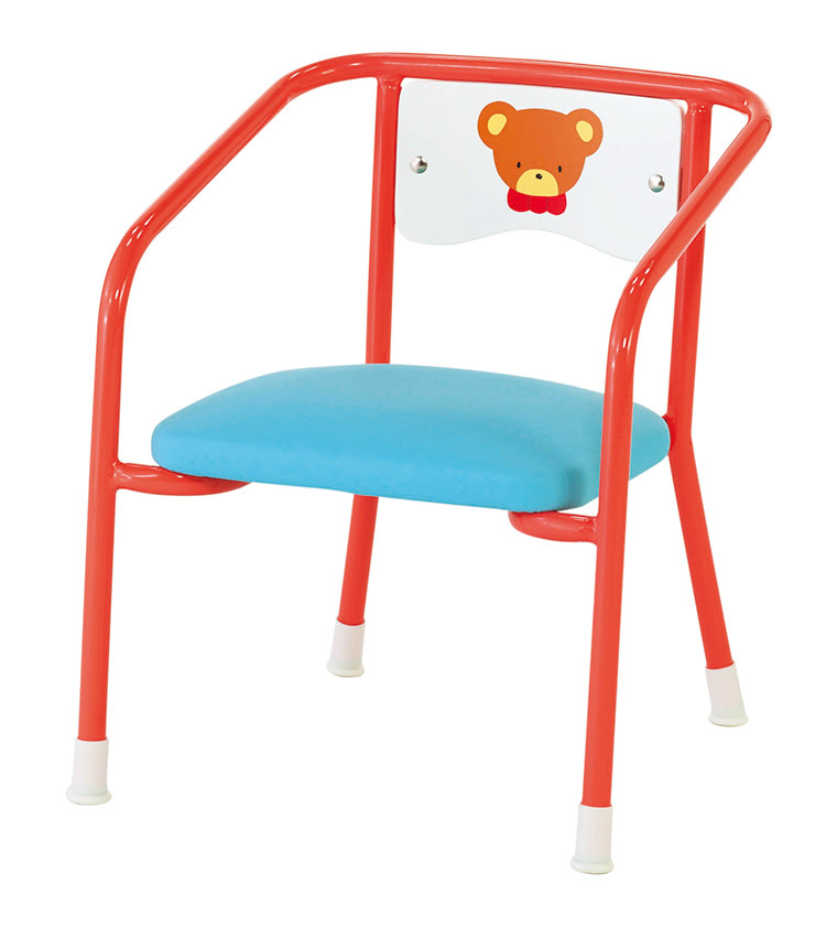 乳幼児向けのひじ掛けの付いたかわいい椅子です。安定性がよく、スタッキングできます。座る部分は感触のよいビニールレザークッションで、汚れも拭き取れます。