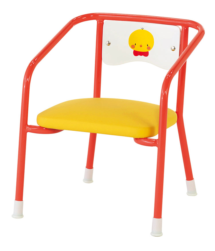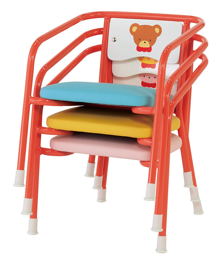乳幼児向けのひじ掛けの付いたかわいい椅子です。安定性がよく、スタッキングできます。座る部分は感触のよいビニールレザークッションで、汚れも拭き取れます。