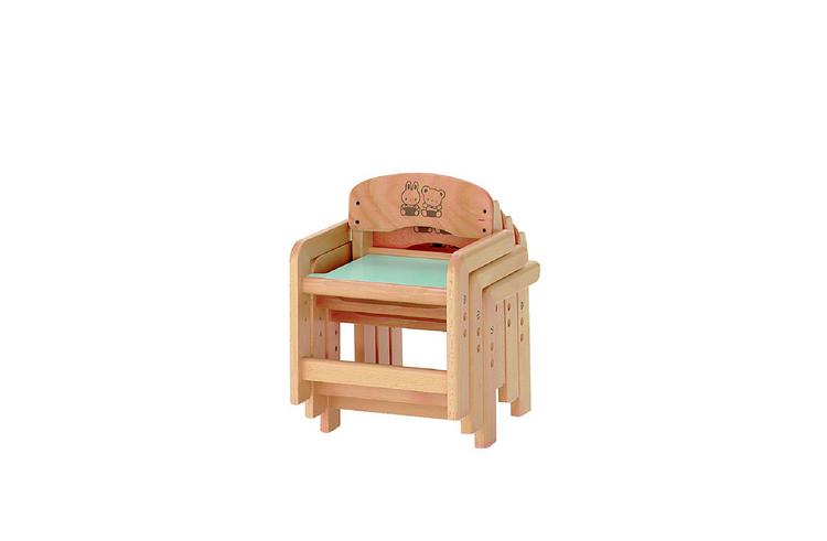 ひじ掛け付きの木製椅子です。座面は3段階(17・20・23cm)の高さ調整ができます。