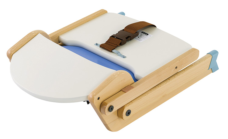 乳児がずり落ちないように股ベルト付で、アームに対しテーブルはフラットに設計されています。使わないときにはコンパクトに折りたためます。テーブルを背へ回すことができます。