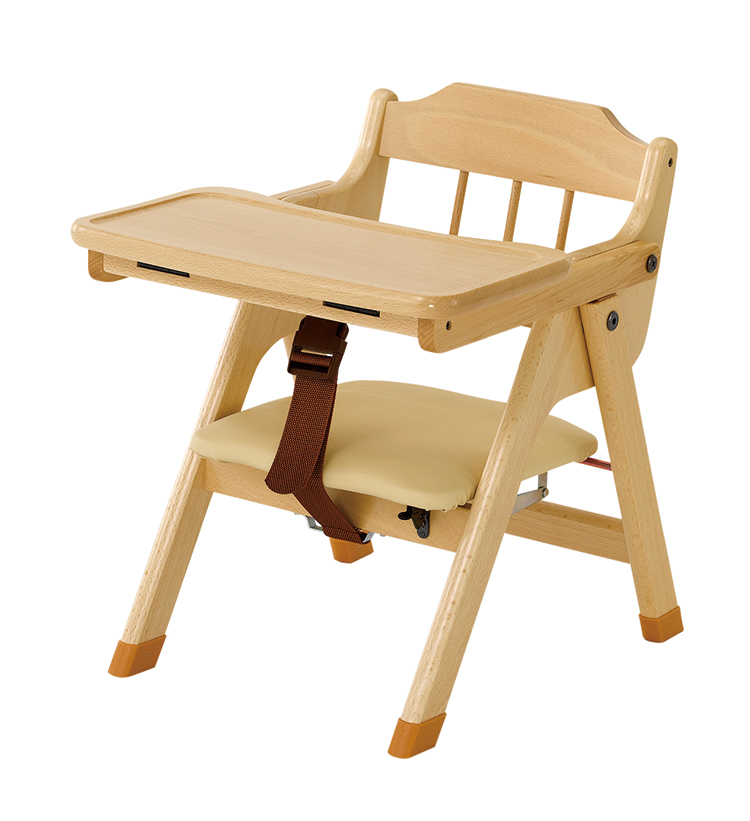 前方へテーブルを起こし、子どもの出入りを容易にした乳児用椅子です。テーブルはバックル式股ベルトで固定でき、テーブルのみ、背へ回すこともできます。