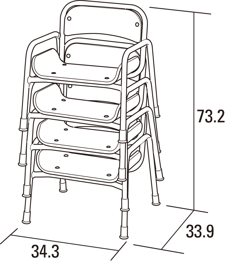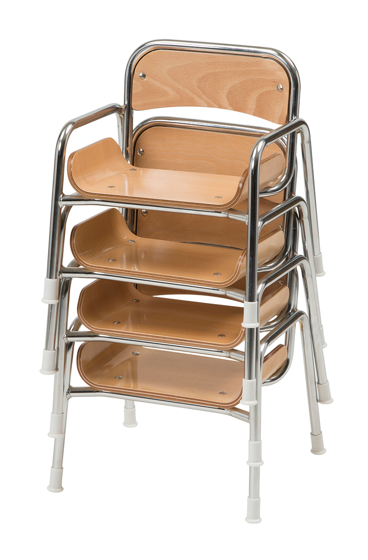 乳児の体をしっかりと抱え込む形の椅子です。座板は側部を曲げているためお尻が安定し、奥行きも対象年齢に応じ浅くなっています。未使用時はスタッキングができますので収納に場所をとりません。
