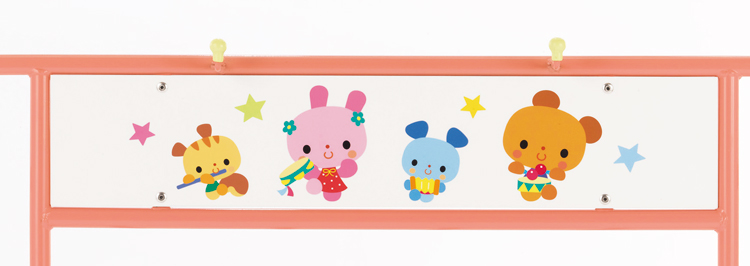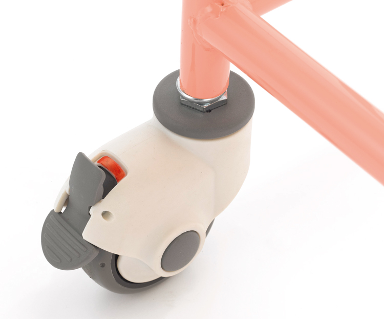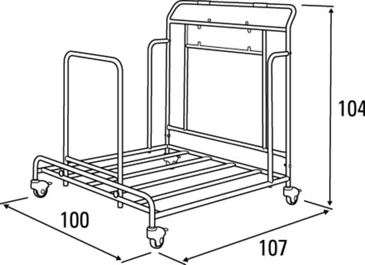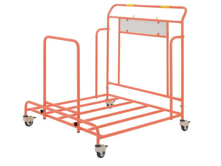 一般的なサイズの運動用マット(90×180cm)を最大6枚まで収納できる専用ワゴンです。前方と両側面にマットが滑り落ちないようガードが付いています。持ち手側には、抜き差し可能なガードフレームを吊り下げるフックが付いています。キャスター付