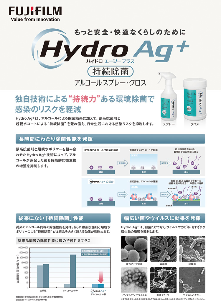 アルコールに銀イオンと超親水性ポリマーを含有させました。アルコールで除菌した後、銀イオン膜でコーティングすることで、菌やウイルスはもちろん、油やたんぱく質汚れも付きにくくなります。また、何度も塗り重ねていくことで、より強いコーティングができ、除菌効果が高まります。