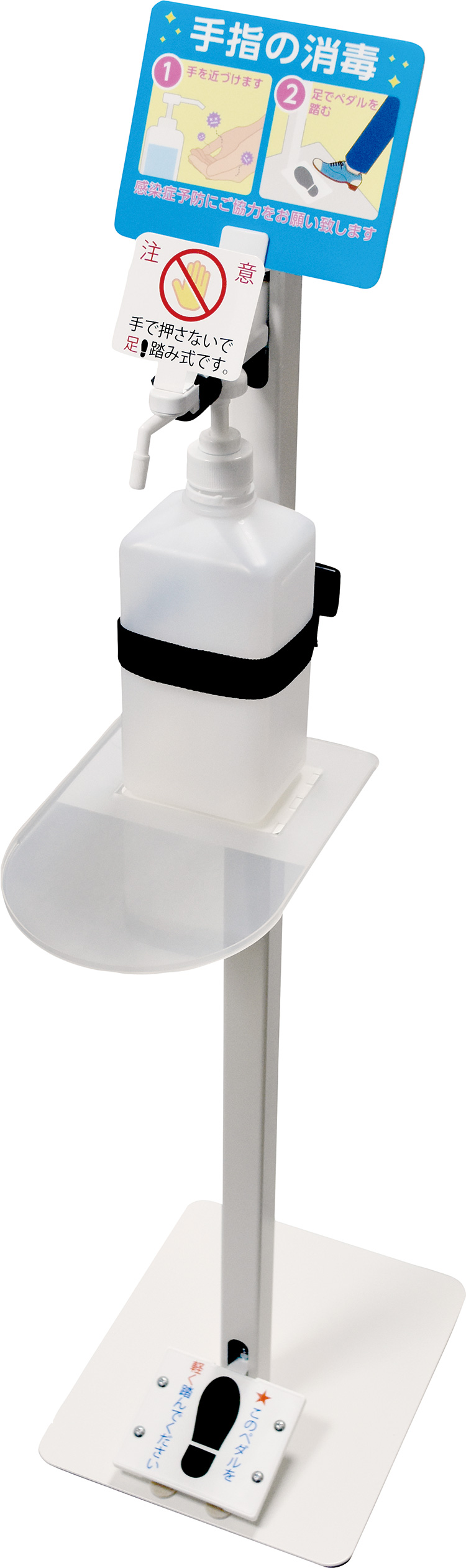 フットペダル式なので、不特定多数の人が触るポンプ部分にもタッチする必要がなく、感染予防に役立ちます。