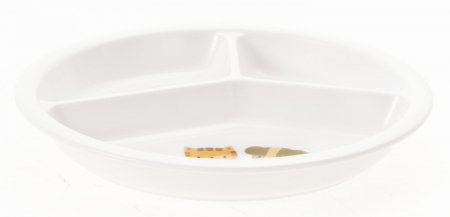 三つ仕切皿(未満児向け)は、すくいやすく、こぼれにくい設計の仕切皿です。立ち上がりがあるので、料理が混ざるのを防ぎます。