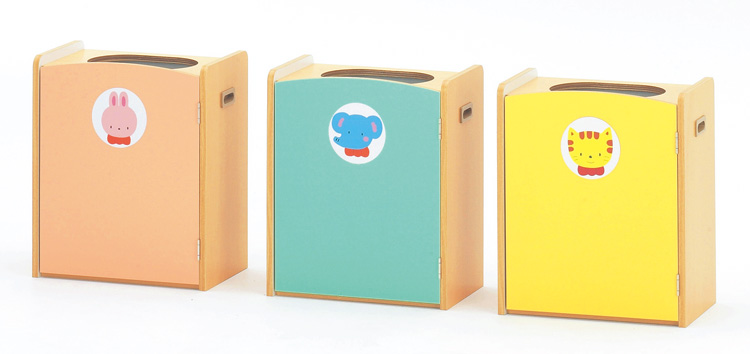 保育室や職員室に合う木目調のダストボックスです。前の扉を開けて、中のケースを出し入れできます。