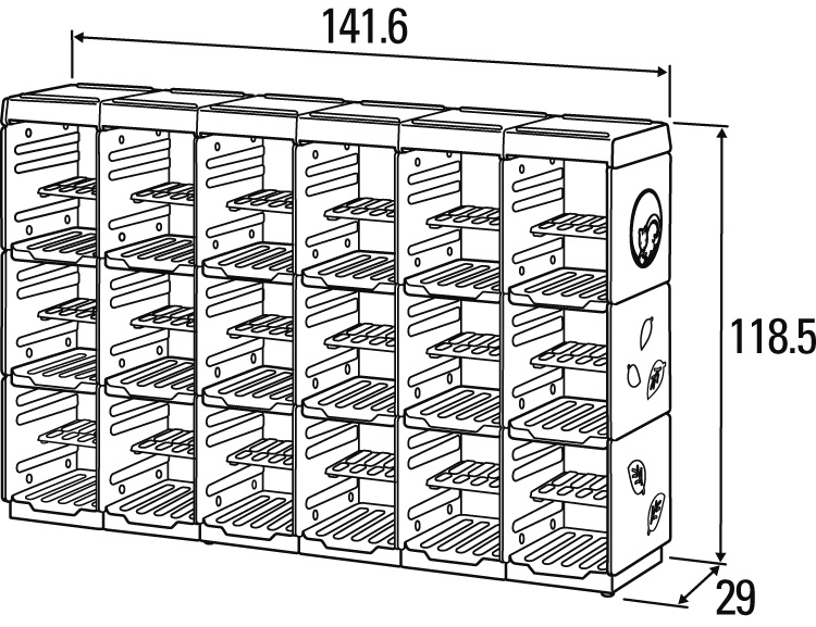 長靴や大きな靴が入りやすく、1列単位で増設できます。棚は2色濃淡でわかりやすく、上履用棚板は跳ね上げ式で水平設置用アジャスター、壁面固定用金具付きです。