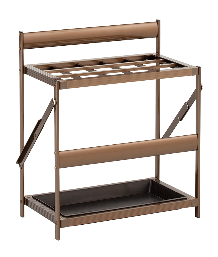 折りたたみタイプなので、収納場所をとりません。アルミ製なので軽く、受け皿は、取り外しができるので洗えます。組み立ては、パッと開けて完成です。