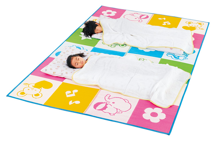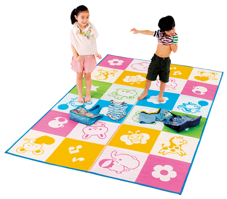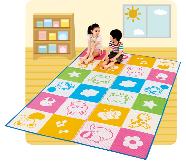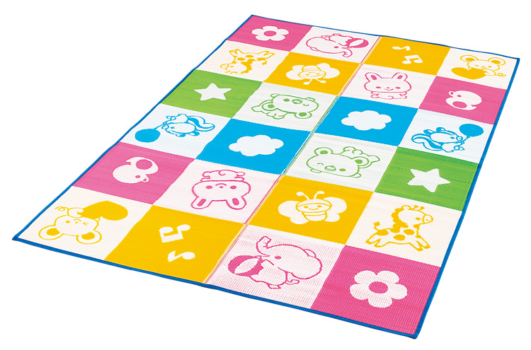 抗菌防臭・防ダニ機能があるポリプロピレン製の見ているだけで思わずにこにこしてしまいそうなかわいいイラスト入りゴザシートです。いつでも、どこでもさまざまなシチュエーションでお使いいただけます。