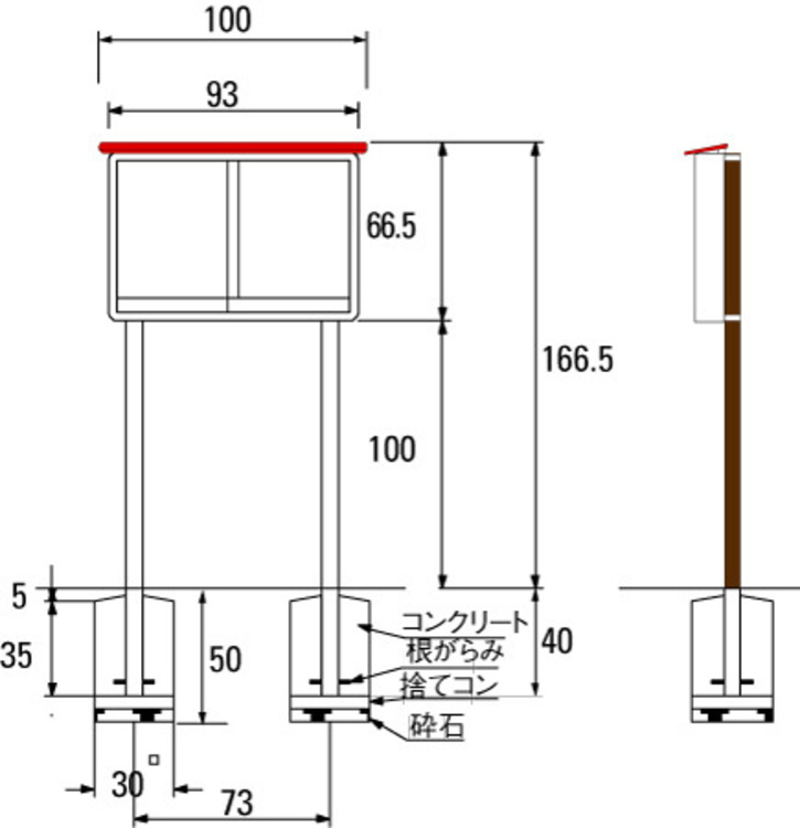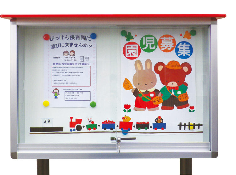 前面はスライド式開閉の強化ガラスで傷がつきにくく、鍵付です。A3判2枚を掲示できます。