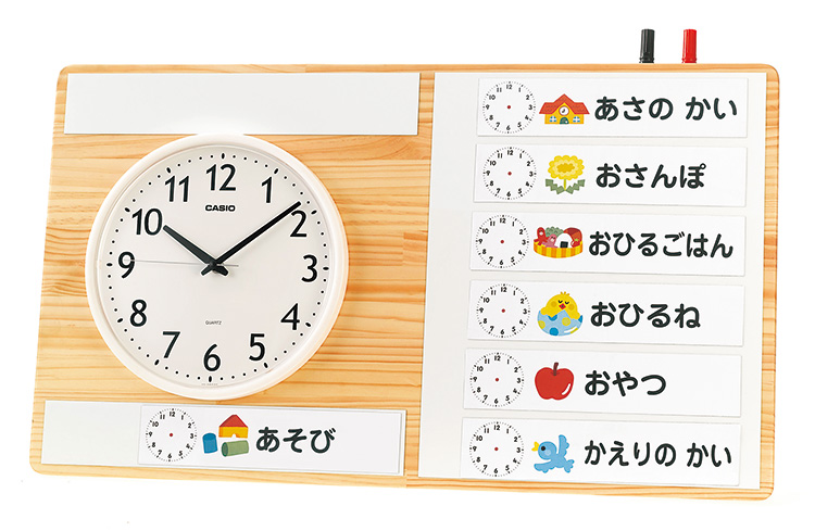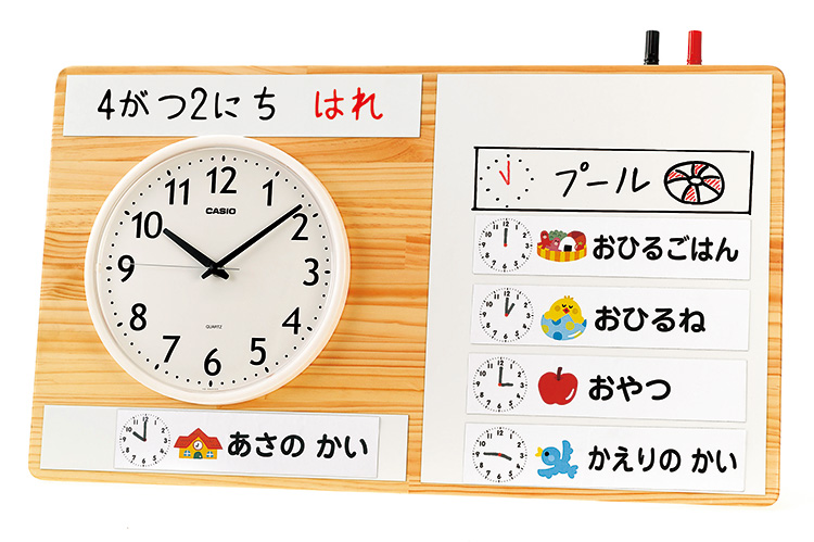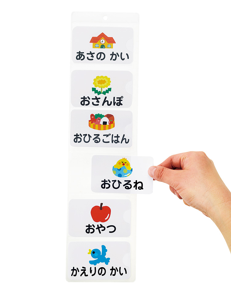 子どもたちが個人で持てる予定表です。カードを差し替えることにより一日の予定が視覚化され、フックを用いれば壁掛けも可能です。名刺サイズの紙をご用意いただければ、オリジナルの手順表として活用することもできます。