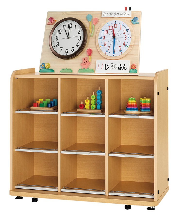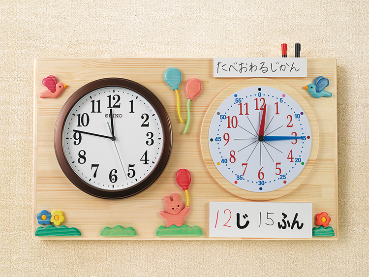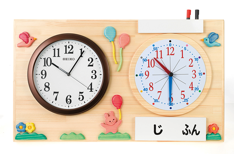 お手本の目標時計と本物の時計を横に並べた、据え置きと壁掛け両方使用可能な時計です。針の色と同じ色の数字を読むことで時間と分の区別ができるようになっていきます。電波時計。