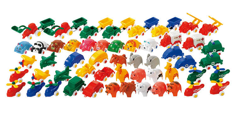 ●セット内容:A=プレイマット2枚・ミニプレイン8台・レスキュー12台・ワークカー6台・トレーラー6台・動物12体・キュートカー9台・乗用車6台・収納バケツ(20L)