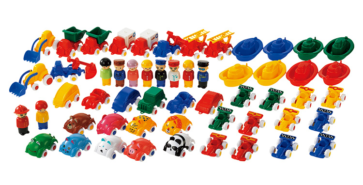 たっぷりの乗り物おもちゃと、プレイマットのセットです。プレイマットの世界観の中で遊びが展開できる乗り物がセットされています。