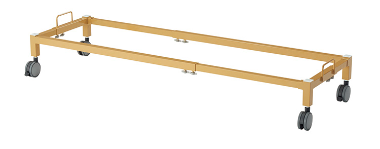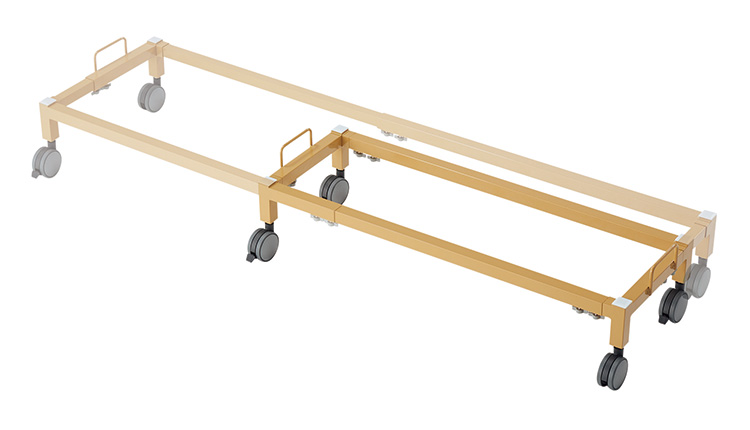 裏面にあるツマミで簡単にサイズ調節ができ、さまざまなサイズのおひるねベッドに対応できる台車です。ステンレスベッドかるつよ130にも対応。