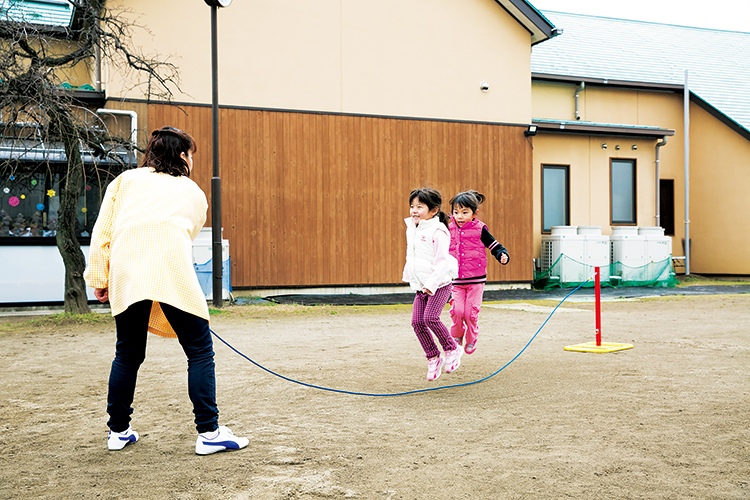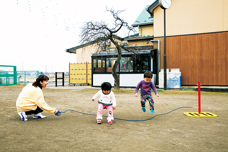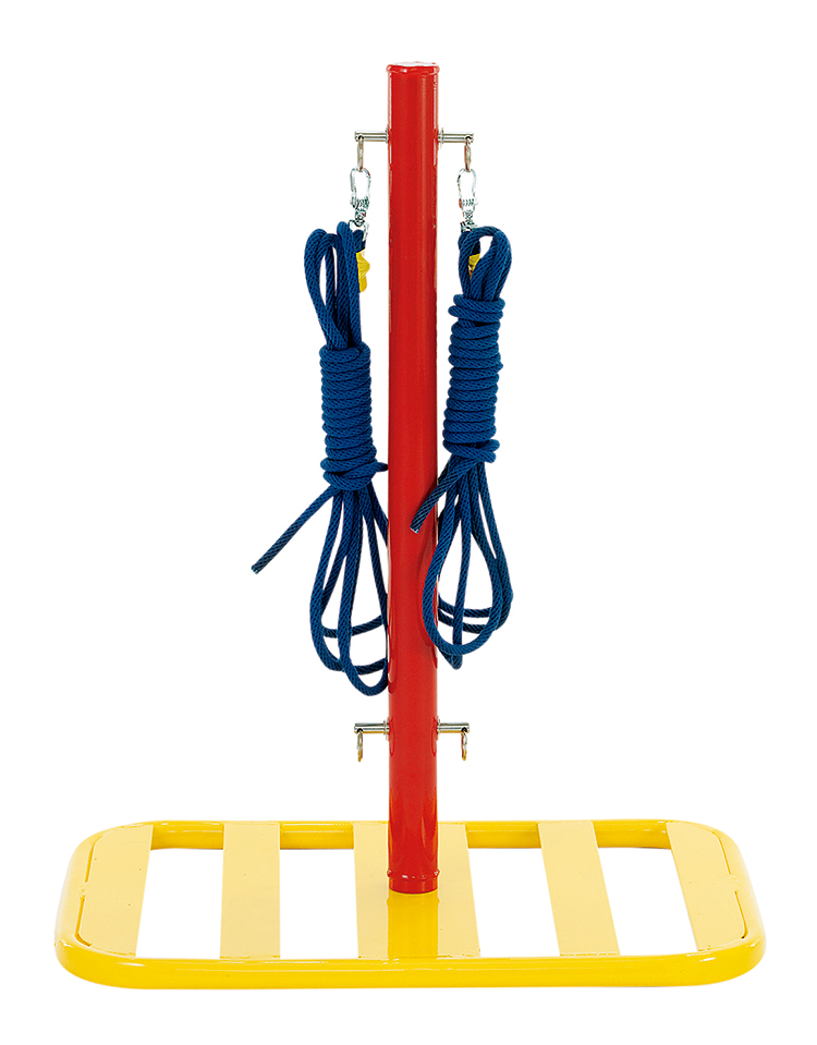 ベース部分が大きく、倒れにくいので安心して使えます。低い位置にもフックがあるので、「へび」や「波」など低年齢児の縄遊びにも使えます。ロープ2本付.