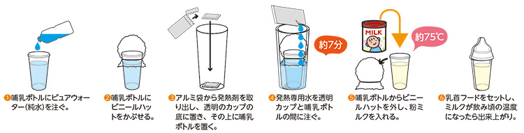 ●セット内容:10回分= 使い捨て哺乳ボトル10個・ピュアウォーター(500ml)4本・発熱剤5袋(1袋2個入)・発熱専用水10袋・沸かし用透明カップ10個・ビニールハット10個 20回分= 使い捨て哺乳ボトル20個・ピュアウォーター(500ml)8本・発熱剤10袋(1袋2個入)・発熱専用水20袋・沸かし用透明カップ20個・ビニールハット20個