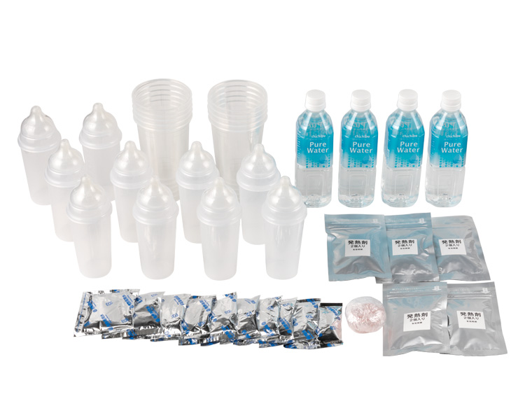 ●セット内容:10回分= 使い捨て哺乳ボトル10個・ピュアウォーター(500ml)4本・発熱剤5袋(1袋2個入)・発熱専用水10袋・沸かし用透明カップ10個・ビニールハット10個 20回分= 使い捨て哺乳ボトル20個・ピュアウォーター(500ml)8本・発熱剤10袋(1袋2個入)・発熱専用水20袋・沸かし用透明カップ20個・ビニールハット20個