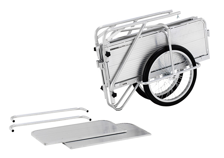 20インチのノーパンクタイヤを使用した、収納や取扱いが楽な折りたたみ式リヤカーです。荷台は、四方をアルミ板で囲っています。最大積載量150kg。