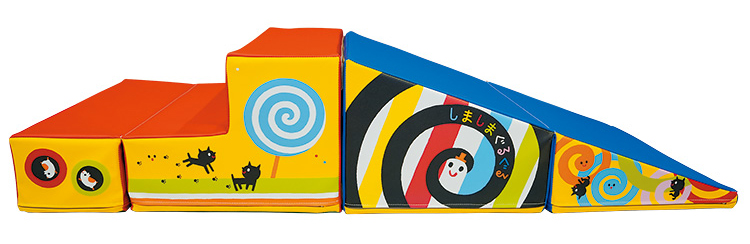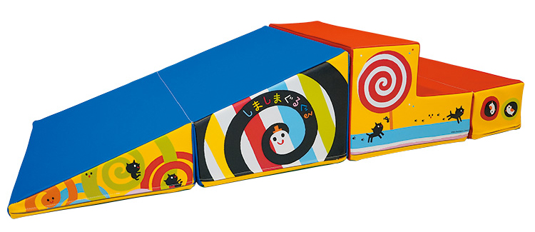 視覚の発達が未熟な赤ちゃんでも見やすい、はっきりした色づかいが特長の「しましまぐるぐる」の室内遊具です。スロープではバランス感覚を、階段では足の運び方を自然に学べるなど、乳幼児の発達段階に応じた運動あそびが楽しめます。使わないときはコンパクトに収納できます。