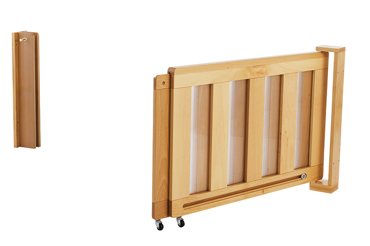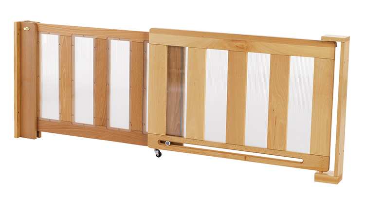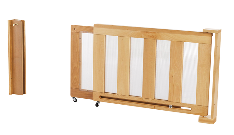 収納側と受け側を壁面または家具に固定して、間仕切り兼用出入り口となります。キャスターで楽に開閉でき、収納側は180°回転しますのでフルオープンにできます。手動でロックが掛けられます。